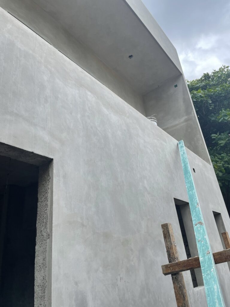 A lot of the work now is finishing the concrete walls. First, a rough coat, and then a smooth finish coat.