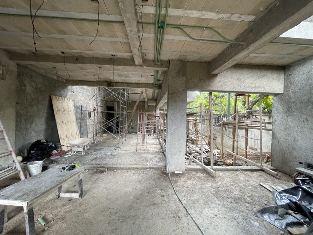 View from the kitchen, looking into the living room on the left, and the pool area on the right.