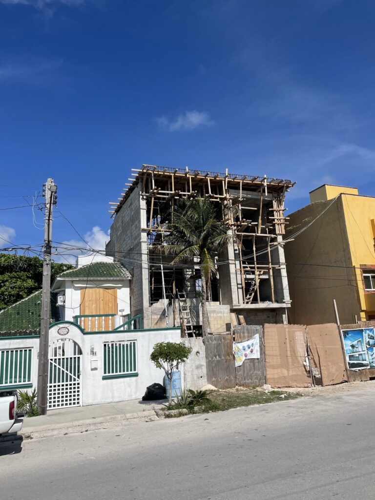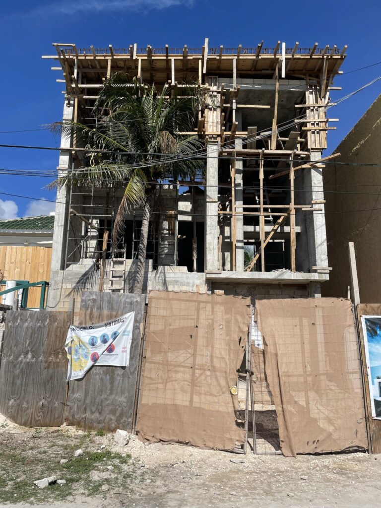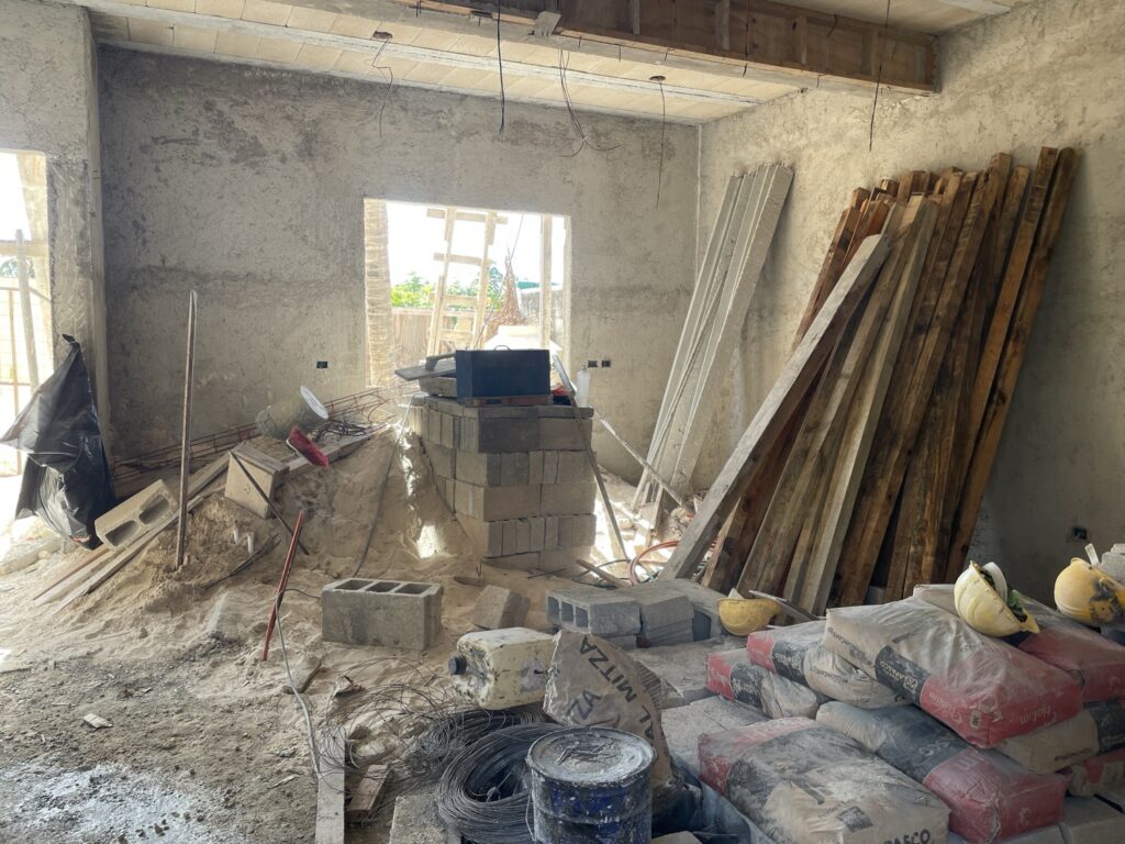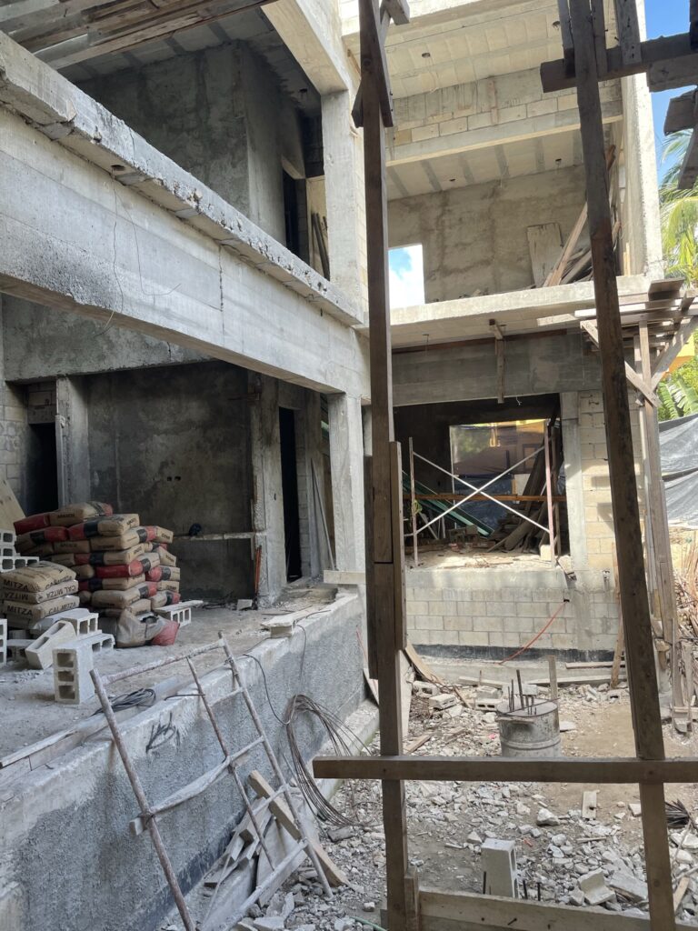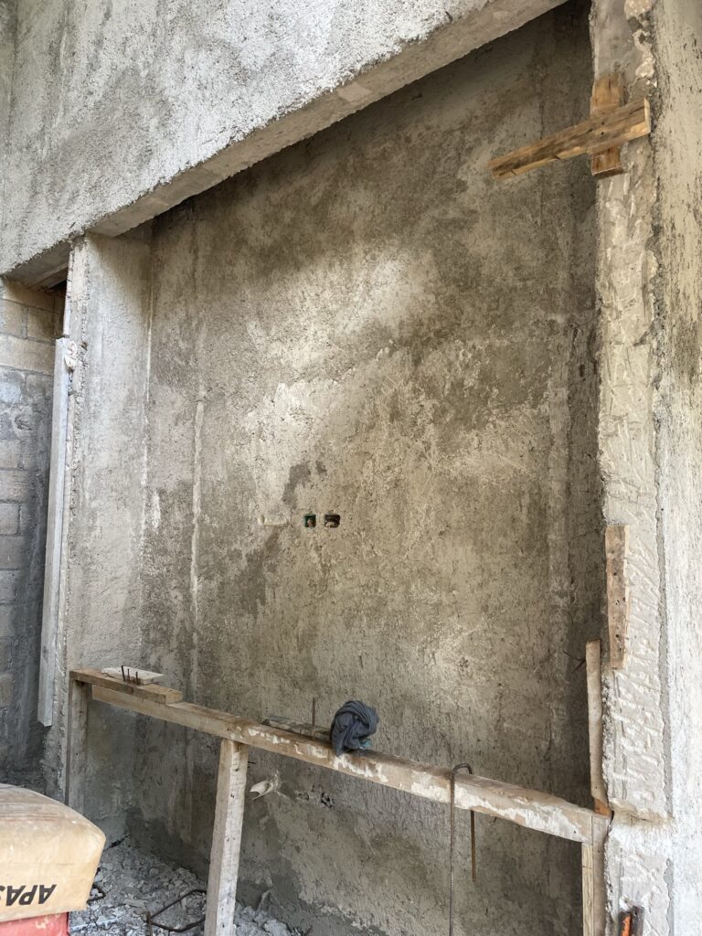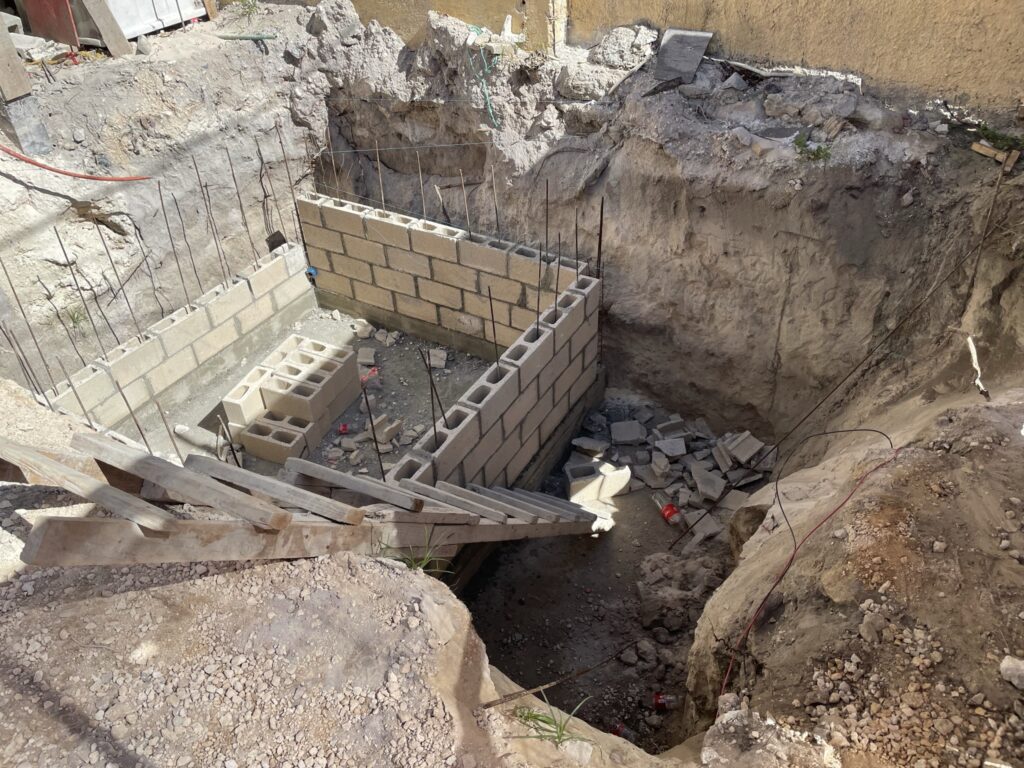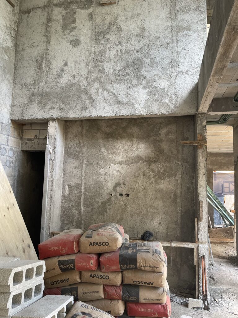 The top roof is being framed out (lots of wood forms and rebar), the underground cistern is in progress, and the interior walls are starting to get their initial rough coat.