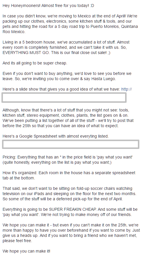 Elizabeth created a facebook event, and invited all of our Austin friends. Here’s the invite: