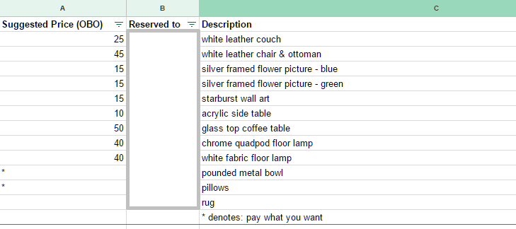 Then, we created a shared Google spreadsheet with all of our stuff. Each room got its own sheet in the workbook. Within each sheet, it listed the item and its cost. Many of our items were un-priced (indicated with an asterisk). This indicated “pay what you want”. Most of those items were generally $5 or less in value.