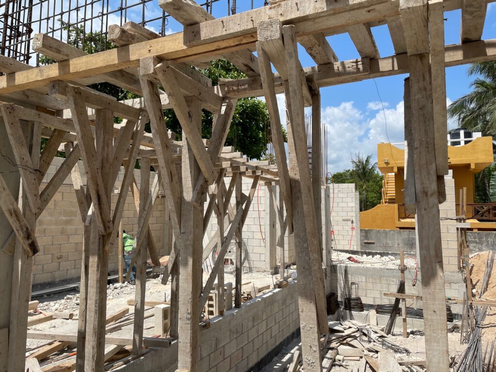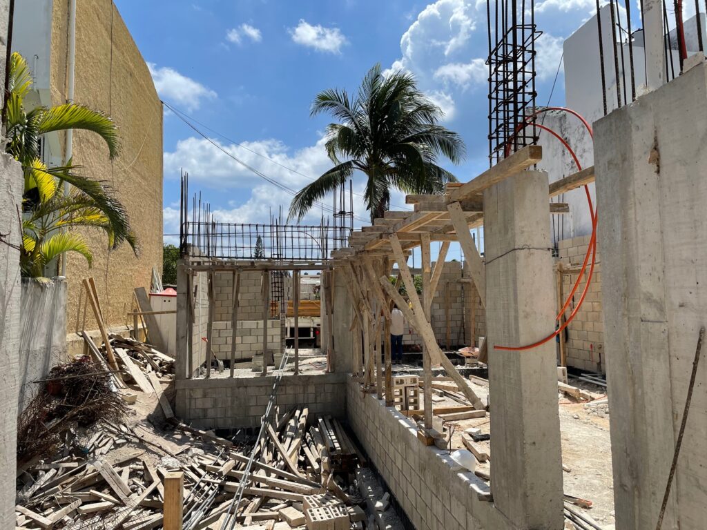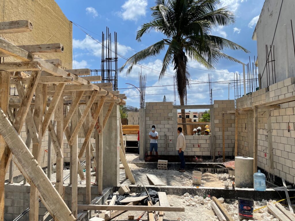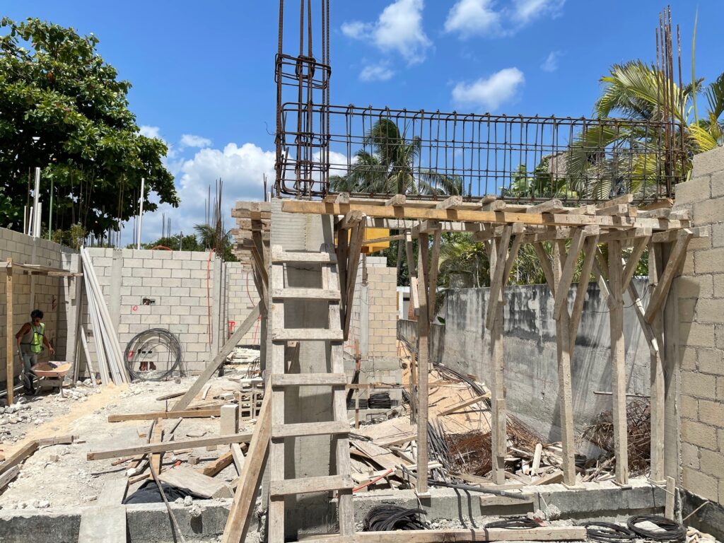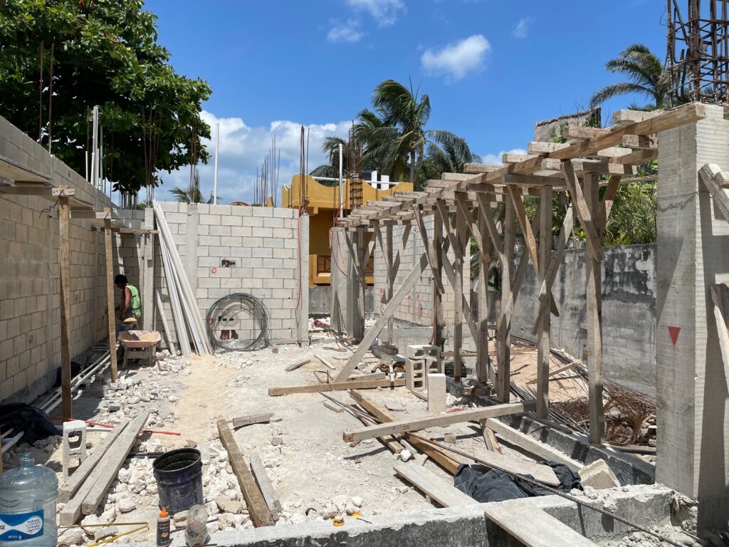 Standing in the kitchen, looking towards the living roomStanding in the kitchen. To the left – living room. To the right – poolIn the hallway – looking towards the poolStanding in the living room. The two closest guys are in the kitchenStanding at the edge of the poolLots of deliveries of concrete, blocks, and rebar
