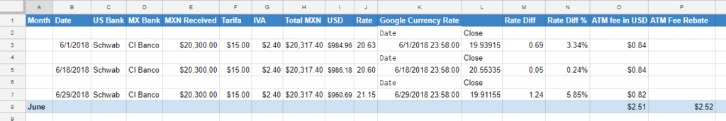 Here’s my spreadsheet showing my ATM withdrawals for June of 2018.