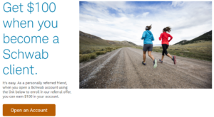 If you sign up for a Schwab using this link, you’ll get a $100 sign up bonus (with a $1000 initial deposit).